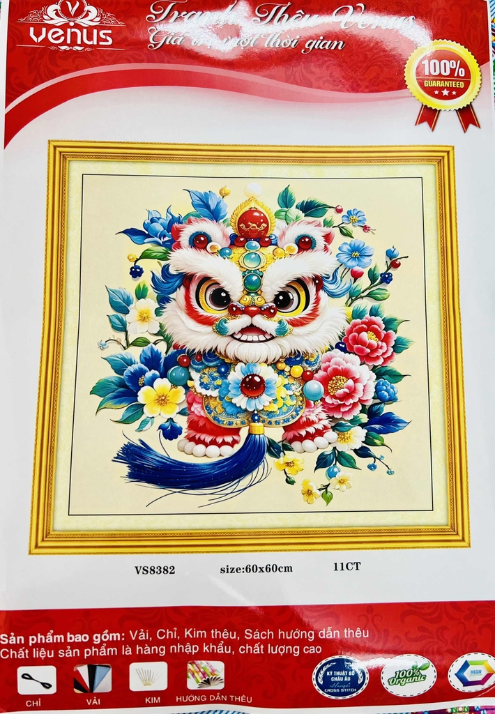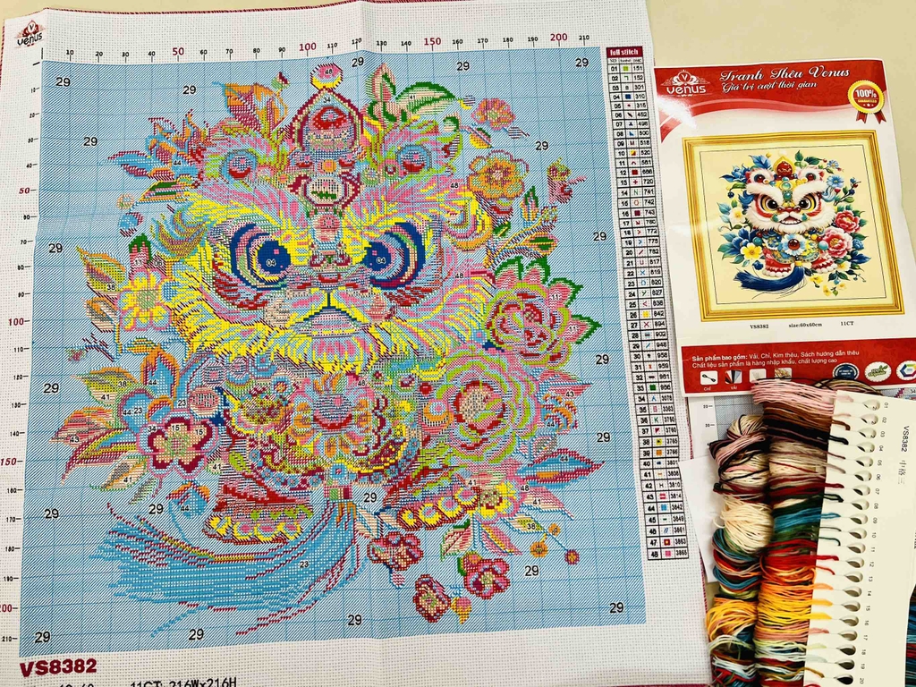 Sản phẩm tranh thêu bao gồm: 02 cây kim, chỉ thêu, chart thêu, vải thêu in các ký hiệu tương ứng với mã màu rất dễ thêu.