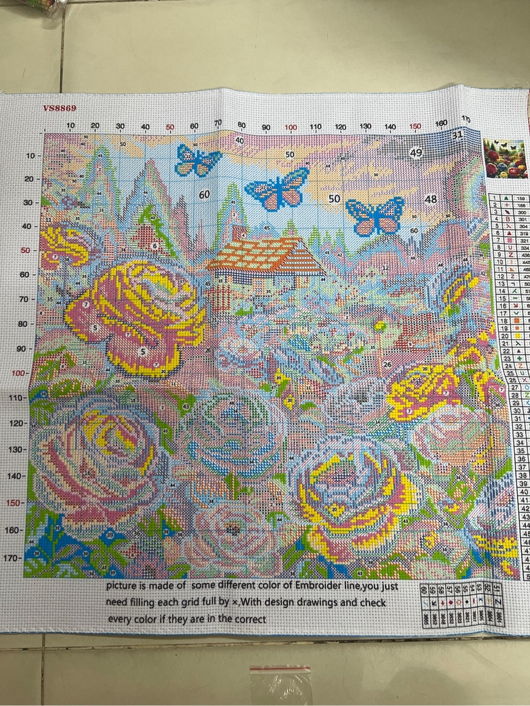 Sản phẩm tranh thêu bao gồm: 02 cây kim, chỉ, chart, vải thêu in các ký hiệu tương ứng với bảng mã chỉ thêu.