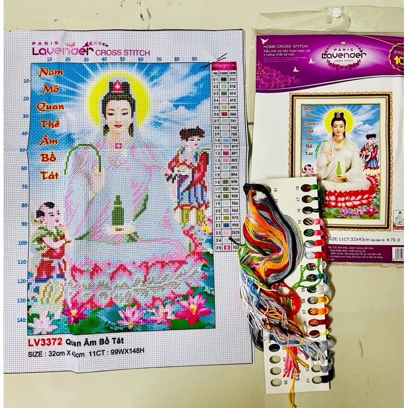 Tên tranh: Tranh thêu chữ thập Phật quan âm LV3372 Thể loại: Tranh thêu chữ thập, sản phẩm này là tranh chưa thêu. Tranh thêu của hãng Lavender màu đẹp, sáng, thích hợp treo trong phòng thờ. Kích thước: 32 x 43 cm Vị trí khách cần thêu trên tranh: thêu phật quan âm + toà sen + 2 tiểu đồng tử. Sản phẩm tranh thêu bao gồm: 02 cây kim, chỉ, vải thêu in các ký hiệu tương ứng với bảng mã chỉ thêu. Tranh in chuẩn, chỉ mịn bền màu với thời gian, bề mặt dày dặn, đã xử lý chống móc, lỗ to, dễ thêu, sản phẩm chất lượng cao. Ngoài ra, khách có thể chat riêng với shop để được hướng dẫn về các đặc tính của sản phẩm hoặc hướng dẫn thêu nếu chưa biết thêu. Khách ở Tphcm có thể đến hcm để mua và xem tranh.