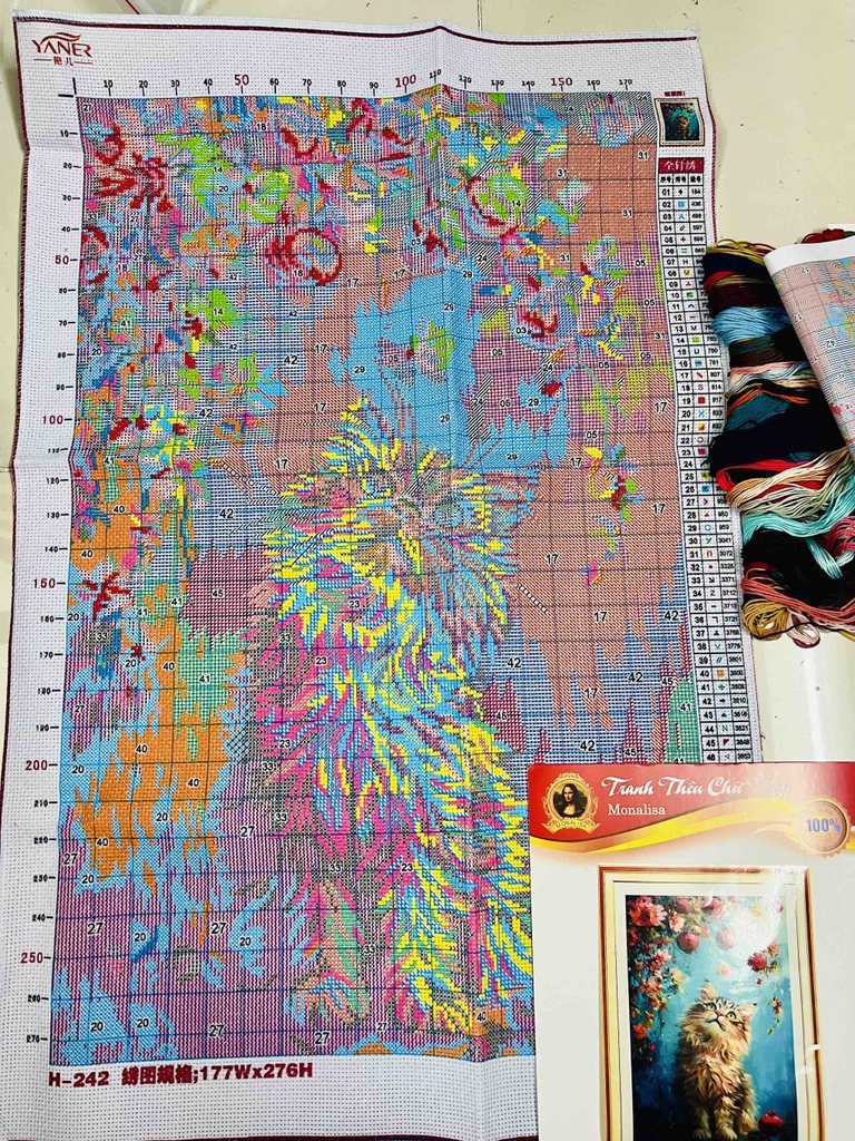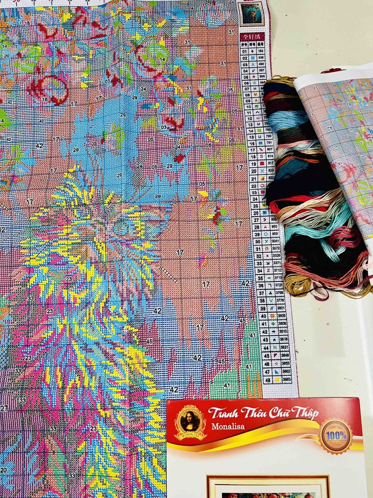 Sản phẩm tranh thêu bao gồm: 02 cây kim, chỉ thêu, chart, vải thêu in các ký hiệu tương ứng với mã màu rất dễ thêu.