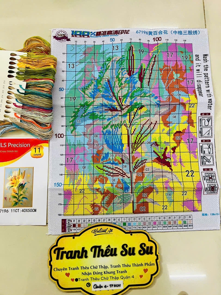 Kích thước 40 x 50 cm Sản phẩm tranh thêu bao gồm: 02 cây kim, chỉ, vải thêu in các ký hiệu tương ứng với bảng mã chỉ thêu. Tranh in chuẩn, chỉ mịn bền màu với thời gian, bề mặt dày dặn, đã xử lý chống móc, lỗ to, dễ thêu, sản phẩm chất lượng cao. Khách ở Tphcm có thể đến hcm để mua và xem tranh.