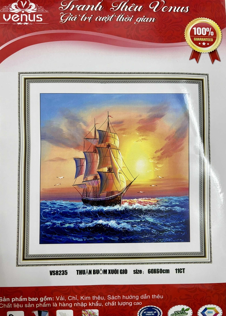 Sản phẩm tranh thêu bao gồm: 02 cây kim, chỉ thêu, vải thêu in các ký hiệu tương ứng với màu chỉ, sơ đồ hướng dẫn thêu