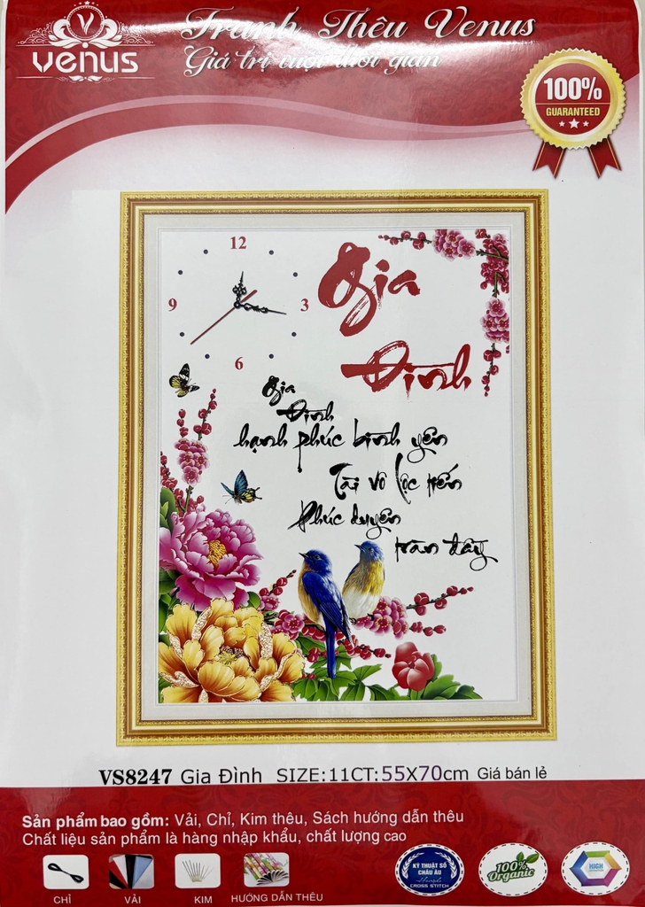 Sản phẩm tranh thêu bao gồm: 02 cây kim, chỉ thêu, vải thêu in các ký hiệu tương ứng với mã màu rất dễ thêu.