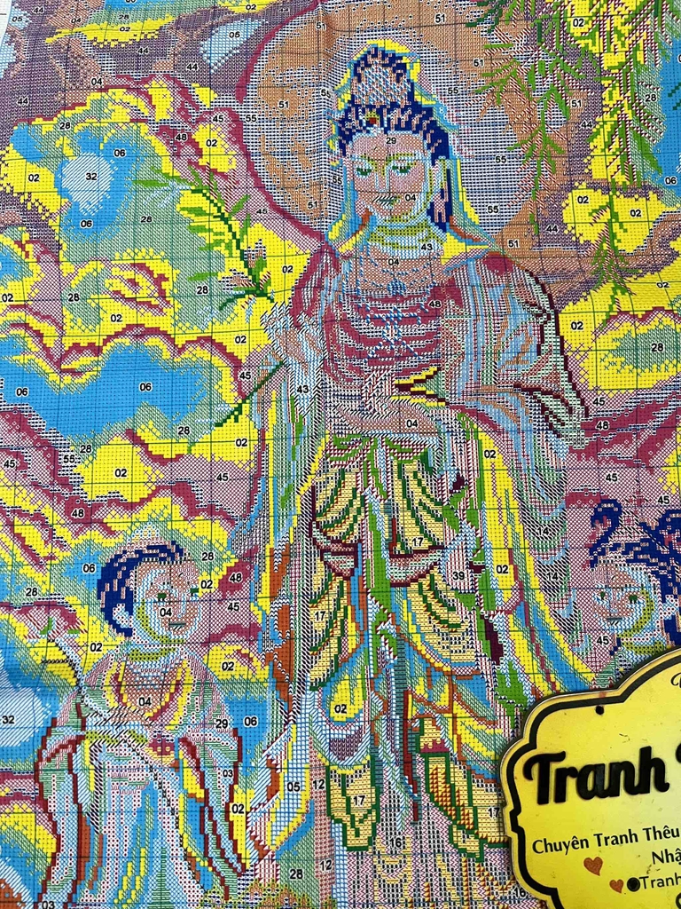 Tranh thêu của hãng mới màu đẹp, tươi sáng, thích hợp treo trong phòng khách.