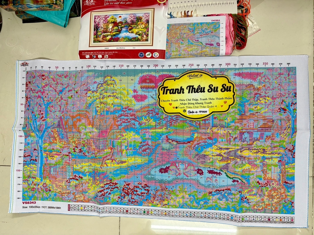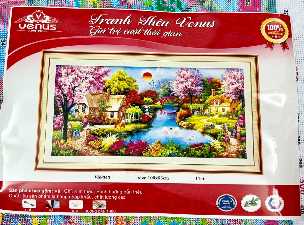 Tranh thêu của hãng VENUS màu đẹp, tươi sáng, thích hợp treo trong phòng khách.